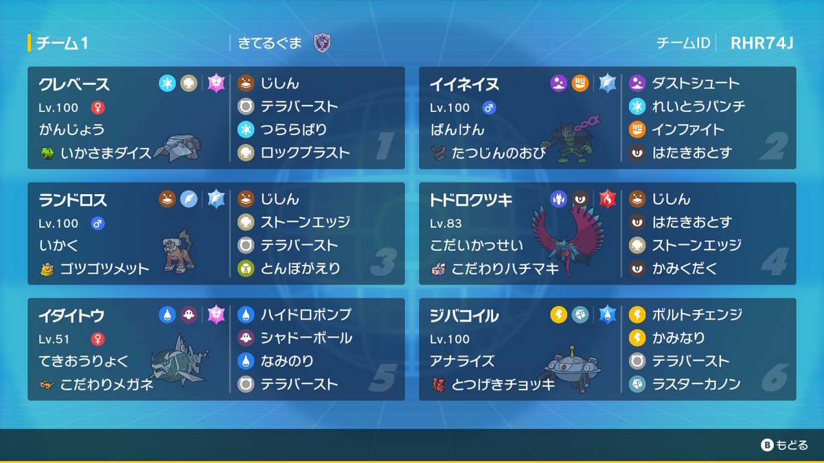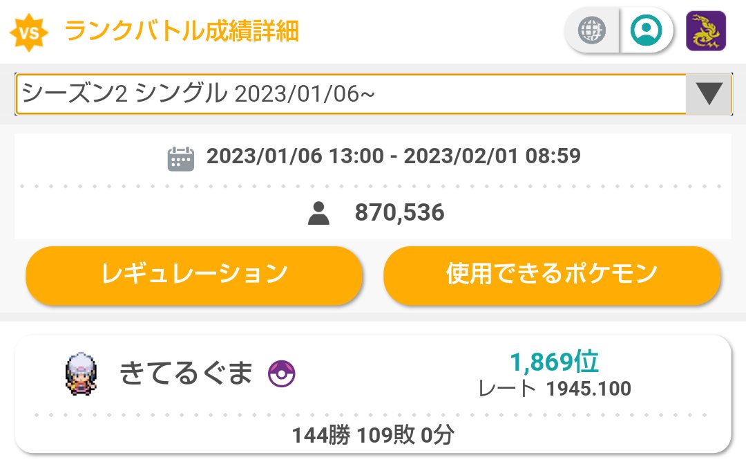 などの単体性能の高い湿原組を採用して、ダイマしたボルトロスやドラパルトとともに湿原組の片方を先発させダイマ退場後に後発から湿原を展開する並びなどを使っていましたが、まるで決まらず逆に300位から大きく順位を落としてしまいました。最終順位は1700位くらい。