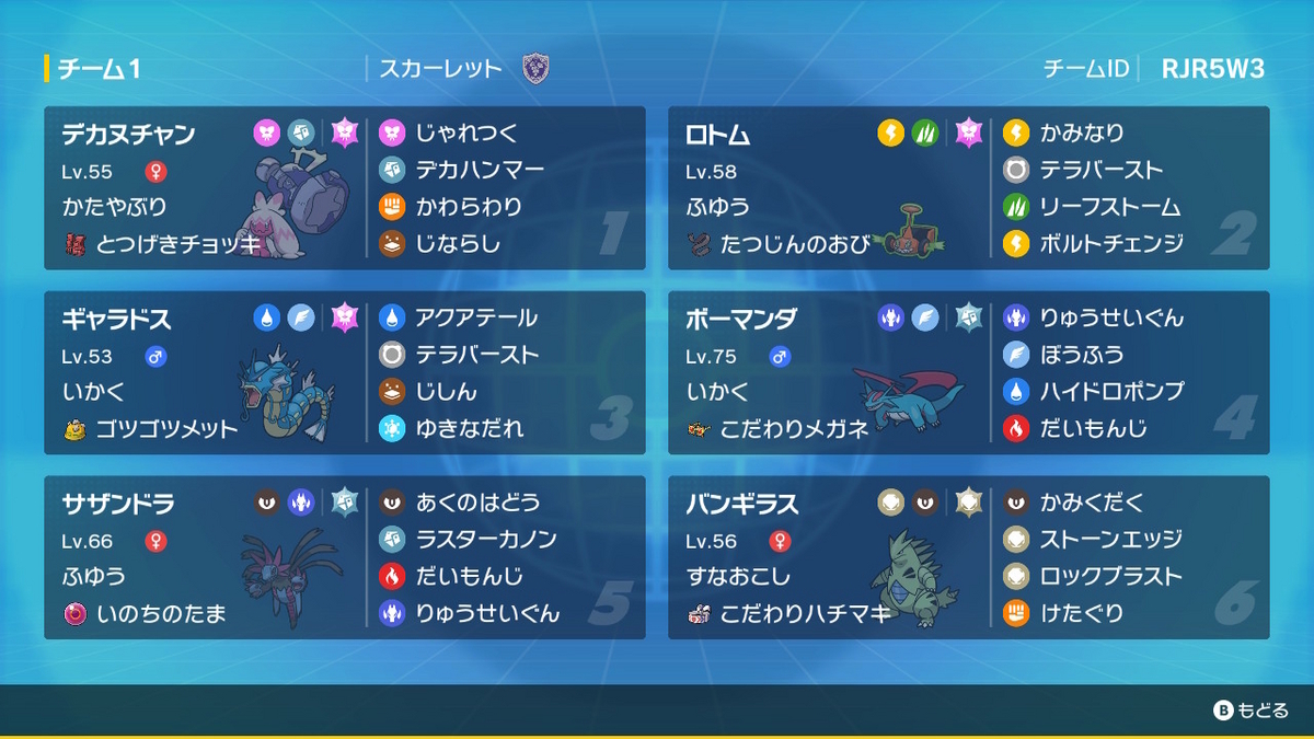 持ち物配分について、構築段階ではヤヤネイヌはサーフゴー後出しにリスクを付けさせたかったため達人の帯か鉢巻が確定しており、宿六・ヤンドロスはなんでもよかったのだが、ヤドロクツキがヤンドより数値受けを呼びがちでここに鉢巻の火力を合わせたかったため残りをヤヤネイヌ帯、ヤンドゴツメとして構築が完成した。