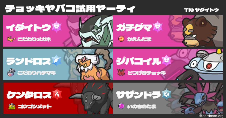 炎に対してはオーガポン実装直後はヤーマンダを使用していたが、ハバタクカミ+炎オーガポンの組み合わせに対して山田ヤバコではサイクル負けしてしまうため、無理に受け出すのではなく双方に勝てるヤケを複数選出することで誤魔化す方針とした。